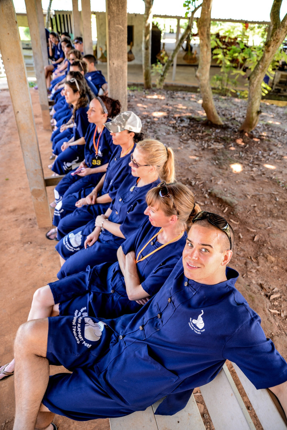 The Thailand Culinary Adventure group getting instructions in how to ride and wash an elephant.